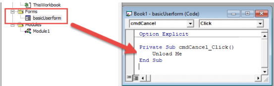 Notice in the example above we added “Unload.Me” to the “Click” event of the Cancel button. So when the user clicks the Cancel button, the form will unload.