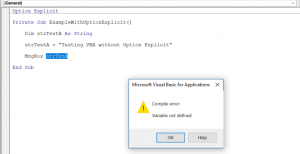 As a result, we get the error “Variable not defined”, because we didn’t declare the strTxtA variable.